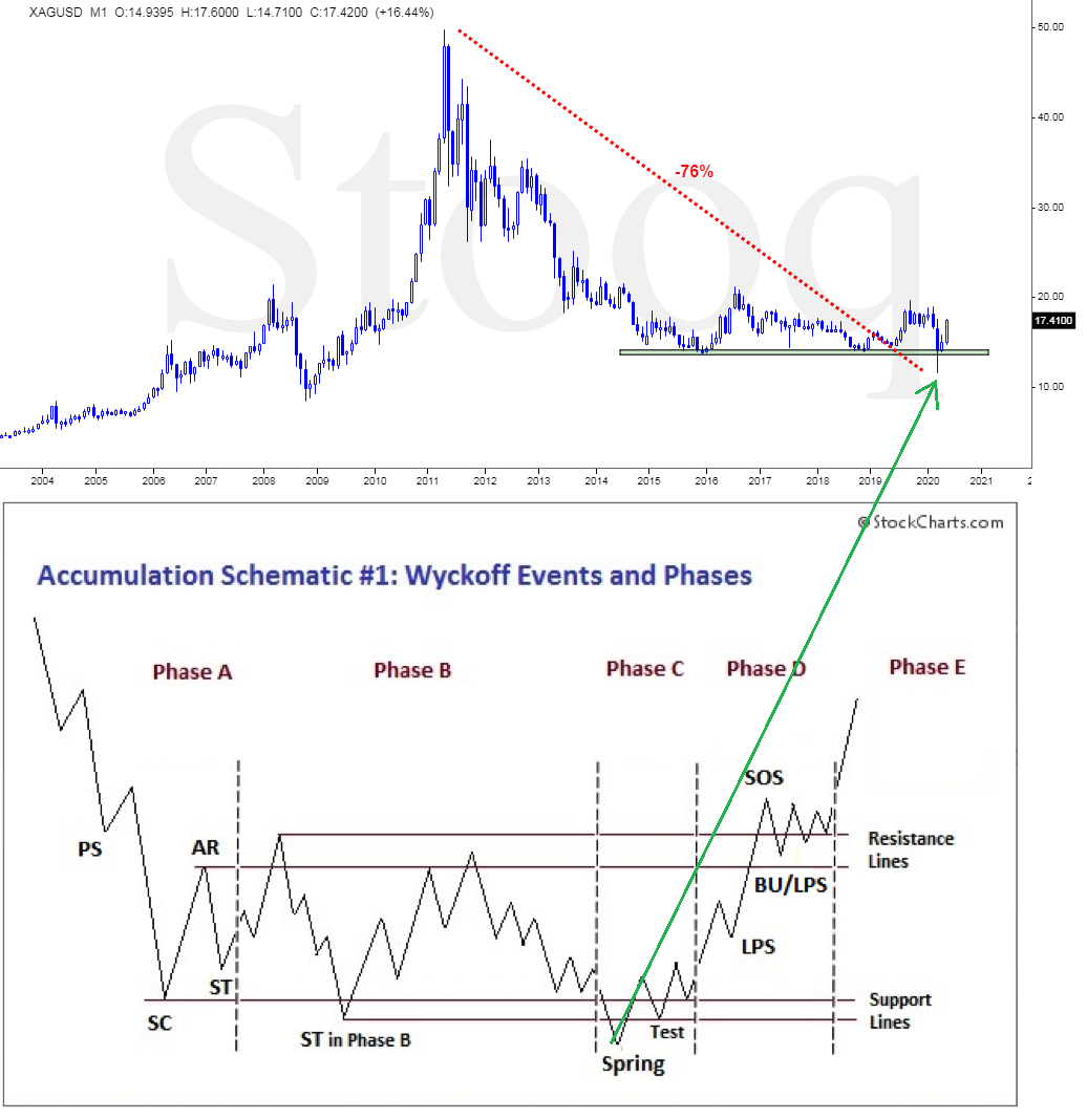 So it’s time to take a look at the silver chart from a longer perspective. From the high of 2011 to the recent low, the price fell by over 76%. It can, therefore, be assumed that the market is “cleaned”. The decline basically stopped already in 2016, and since then a horizontal trend has been built, which can also be determined by the accumulation phase. The recent breaking of the lows from recent years and a quick return (on the monthly candle only the bottom shadow violation) was a classic bull trap. Who had localized SL’s under lows (very clear, horizontal support) was thrown out of the market. This situation is similar to Wyckoff’s accumulation model. It can, therefore, be assumed that we are currently in phase C on silver.