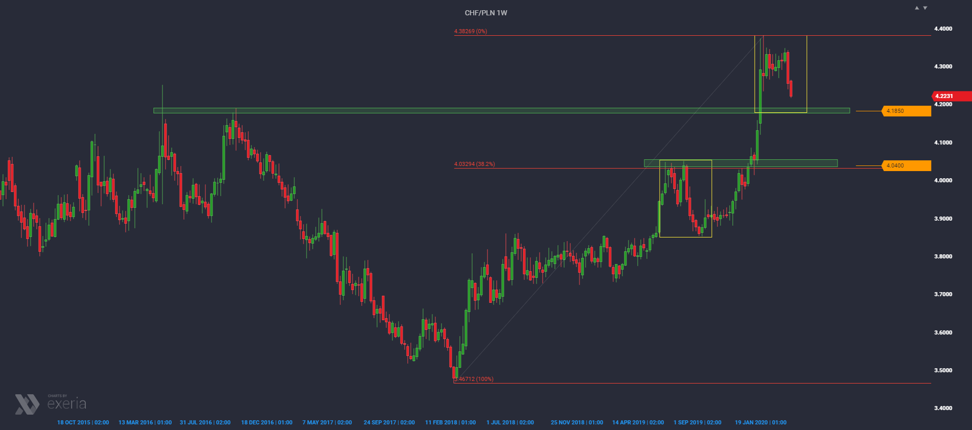 PLN, like many other markets, has moved sideways in recent weeks. Last week has already signaled that the market will move to correction. The franc sellers managed to leave a long, negative candle on the weekly chart, and the market left the range of almost 2-month fluctuations. So we move to correction and it’s time to look at what levels the franc in relation to PLN has a real chance of weakening.
